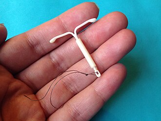 [[Image: Mirena IUD with hand.jpg |thumb| Intrauterine device (WC/Sarahmirk).]] | |||