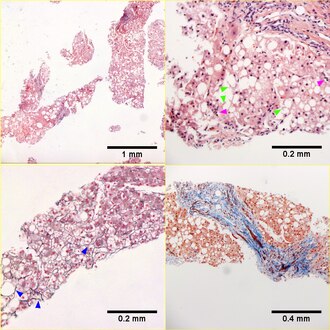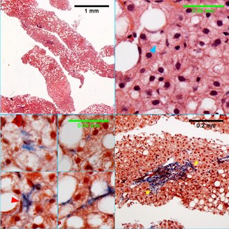 | Necroinflammatory grades Brunt 2, NAH 7. Fibrosis stage 3. About 70% of hepatocytes are afflicted by steatosis (UL). Many ballooned cells are present, with their residual tufts/flocks (UR green arrowheads) demarcating multiple cells having formed apparent fat cysts. Two-three acinar inflammatory foci (UL magenta arrowheads) can be seen in a 20X field. The disorder is emphasized by a reticulin stain which shows the thin black lines (LL blue arrowheads) forming acinar circles, heading in irregular directions, and coming closer and separating from adjacent lines with great variability. The trichrome stain (RL) shows a bridge. Original oculars UL 4X, UR 20X, LL 20X, LR 10X | |