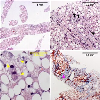 - ↑ Gramlich, T.; Kleiner, DE.; McCullough, AJ.; Matteoni, CA.; Boparai, N.; Younossi, ZM. (Feb 2004). "Pathologic features associated with fibrosis in nonalcoholic fatty liver disease.". Hum Pathol 35 (2): 196-9. PMID 14991537.