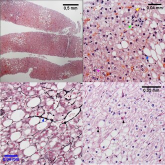 | Necroinflammatory grades Brunt 1, NAH 3. Fibrosis stage 0. About 25% of the liver shows steatosis (UL), not pan-acinar. Only rarely identified were either ballooned hepatocytes or inflammatory aggregates. UR shows more macrovesicular (blue arrowhead) than microvesicular (yellow arrowhead) steatosis, with occasional neutrophils in acini ( tip of green arrowhead, benath inflammatory aggregate, with tuft of material in ballooned hepatocyte at base of green arrow), and many glycogenated nuclei (magenta arrowhead). Additional evidence of hepatocellular damage is seen on the reticulin with focal zone III collapse (LL, blue arrowhead) and on the PAS with diastase stain with PAS-D Kupffer cells (LR black arrowheads)