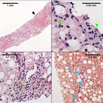 - ↑ Brunt, EM.; Tiniakos, DG. (Nov 2010). "Histopathology of nonalcoholic fatty liver disease.". World J Gastroenterol 16 (42): 5286-96. PMID 21072891.